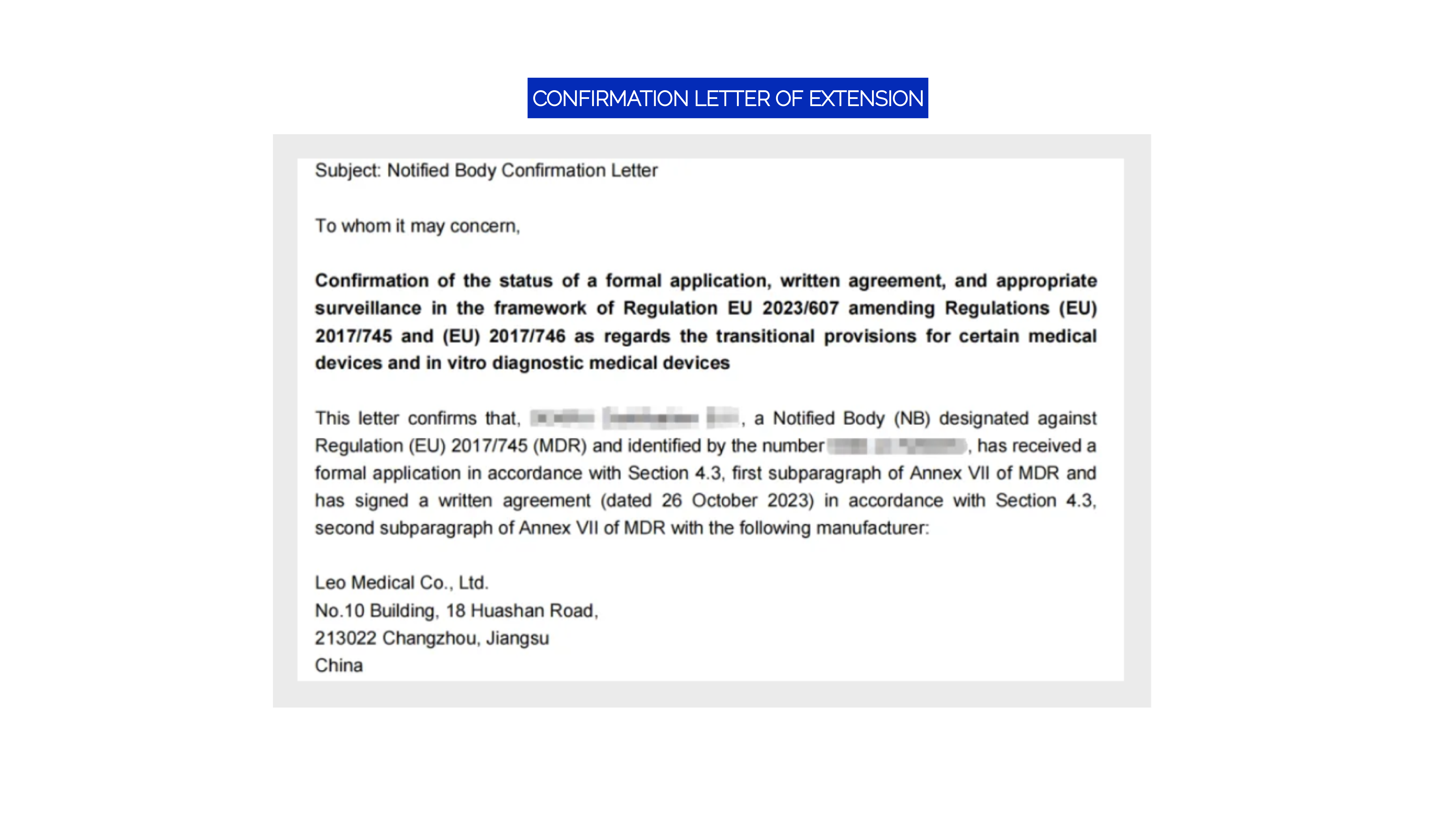 On June 20, 2024, Leo Medical received a confirmation letter issued by the notified body, explicitly stating that LEOMED has submitted a formal application for MDR conformity assessment in accordance with the EU's extended transitional provisions bill for MDR. Both parties have signed the MDR certification contract. Since then, the MDD CE certificate has been successfully extended, allowing the original MDD certificate to remain valid until December 31, 2028.